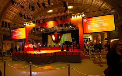 A video solution with two projected display surfaces at the stage, video mixing and computers for presentations and film screening. TV screens for the gas clock and display modules around the central concourse were also delivered. Read more about video & ledDecor & Set Design