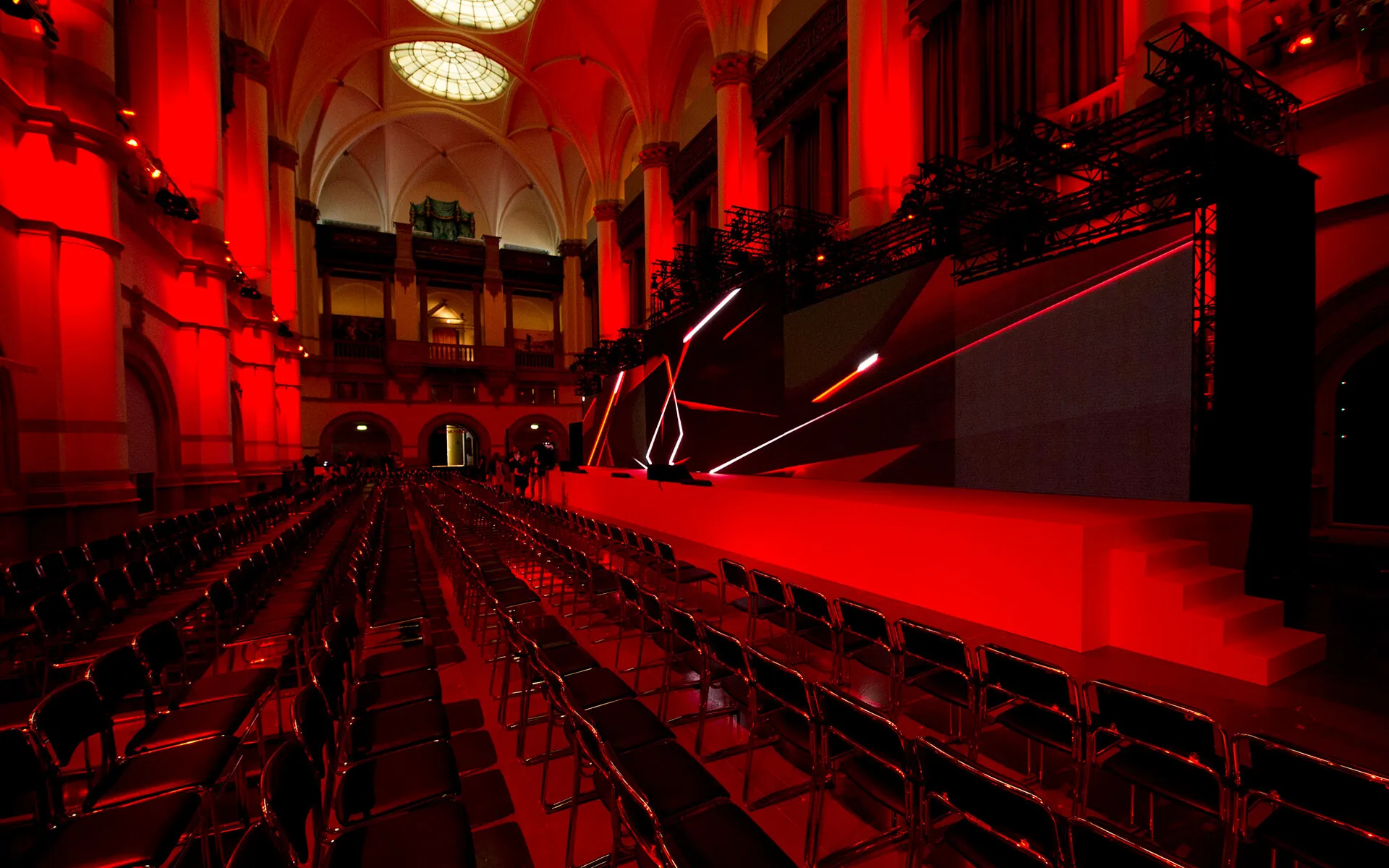 A massive 20×4 m LED screen, video mixing and control, and presentation display technology. Read more about video & ledDecor & Set Design