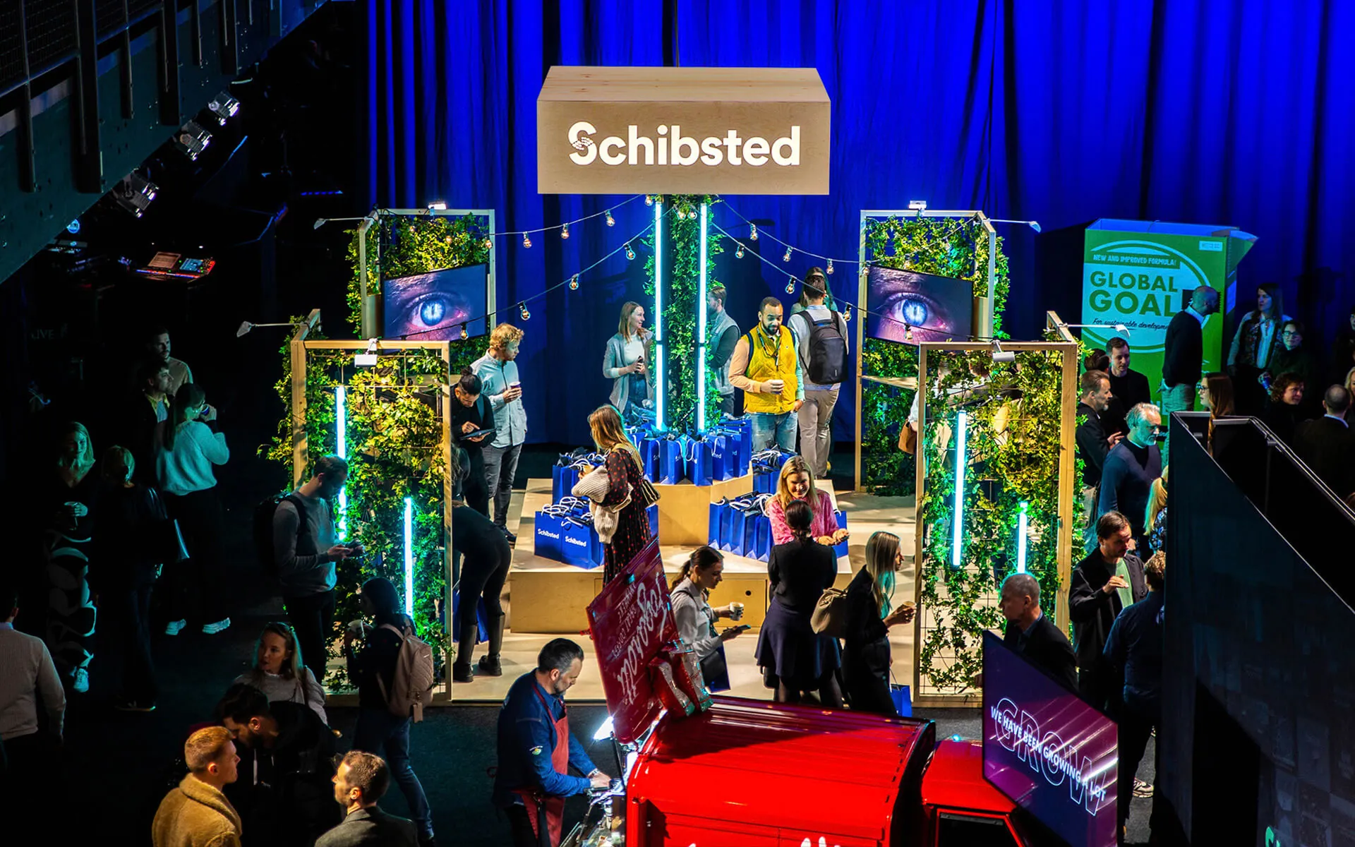 Our carpentry workshop has produced a broad range of custom solutions for events at Annexet – from exhibition stands and stage platforms to bespoke installations and entrance portals. For Schibsted's stand at NextM we built a 360-degree stand with a truss tower clad in ivy and Astera Titan Tubes, topped with a four-sided LED light box. This is exactly the kind of work we thrive on.Content & Graphics